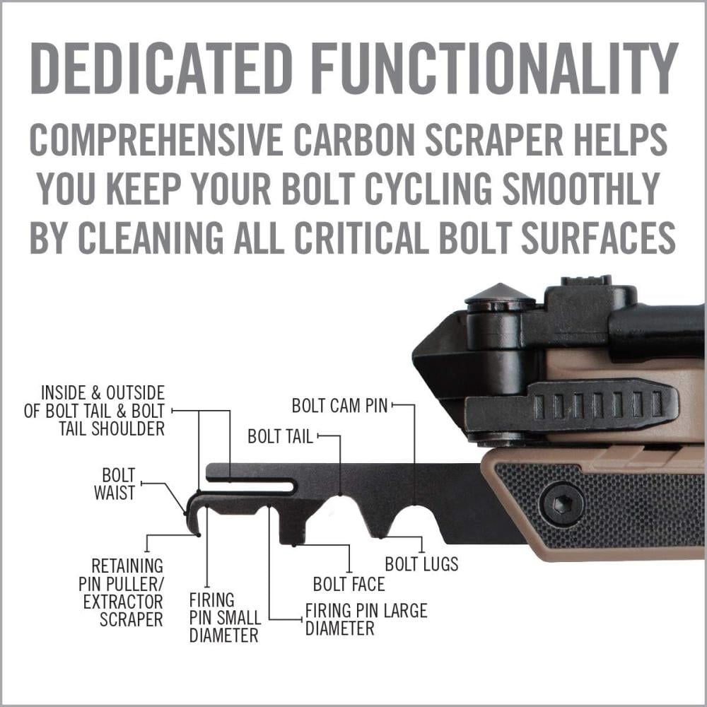 الميزة البارزة هي مكشطة البراغي الدقيقة ذات 10 وظائف، والمصممة لتنظيف الكربون من جميع أسطح مجموعة حاملات البراغي المهمة، مما يضمن التشغيل السلس. ويكتمل هذا بمجموعة شاملة من القطع وغمد من النايلون الباليستي المتوافق مع MOLLE، مما يجعله ملحقًا محمولاً وأساسيًا لأي مالك AR15.