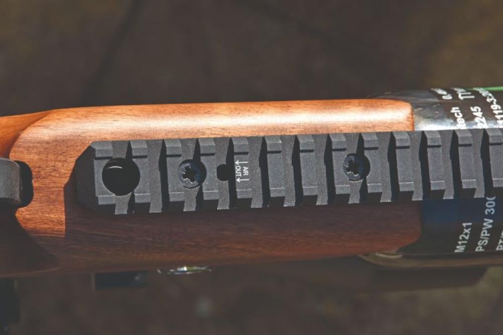 بينما يوجد أسفلها جسر بطول 16 سم لربط ركيزة البندقة (bipod). يعجبني كيف يبرز حوالي 5 سم تحت أسطوانة الهواء من نهاية المخزون.