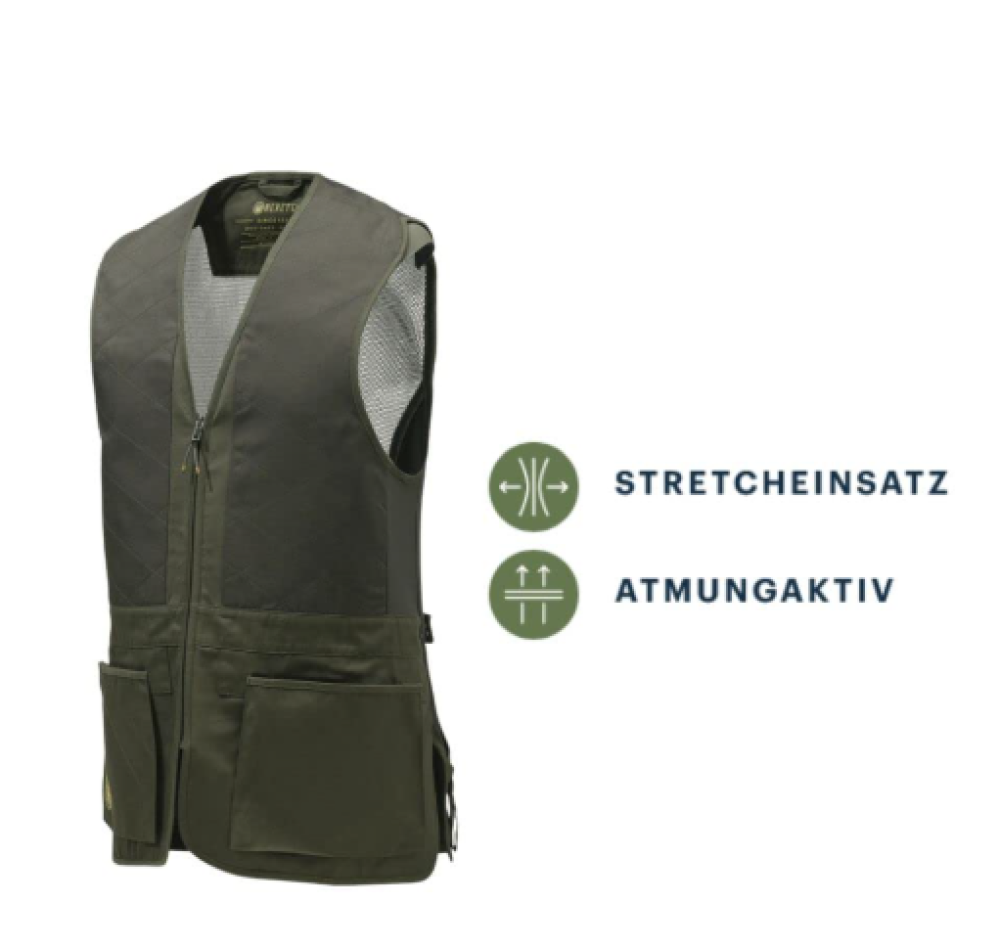 صديرية الرماية Beretta Tredi مصنوعة من قطن ثقيل بوزن 227 جرامًا، مع ظهر من شبكة ثلاثية الأبعاد وإدخالات مرنة على الجانبين لتوفير الراحة والملاءمة القابلة للتكيف.