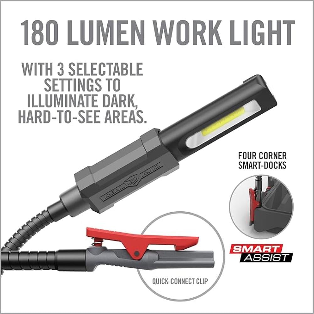- يتضمن مصباح عمل 180 لومن مع 3 إعدادات للاختيار من بينها لإضاءة المناطق المظلمة التي يصعب رؤيتها. تتميز بذراع دعم متحرك وأربعة أنظمة توصيل سريعة التوصيل توفر المساعدة بدون استخدام اليدين